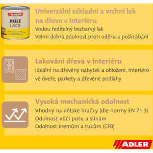 Lak na dřevo ADLER Holzlack lze použít v celém interiéru včetně lakování podlah, nábytku a dětských hraček. Snadno se aplikuje štětcem i válečkem a má výborný rozliv.