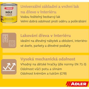 Lak na dřevo ADLER Holzlack lze použít v celém interiéru včetně lakování podlah, nábytku a dětských hraček. Snadno se aplikuje štětcem i válečkem a má výborný rozliv.