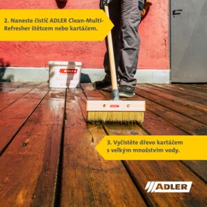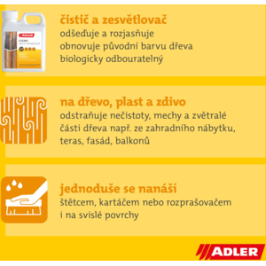 Efektivní čistič, osvěžovač a obnovovač na zvětralé a zašedlé dřevo, terasy, fasády, ploty, zahradní nábytek a další povrchy z plastu, kamene a zdiva. Produkt je vhodný pro kutily i komerční použití.