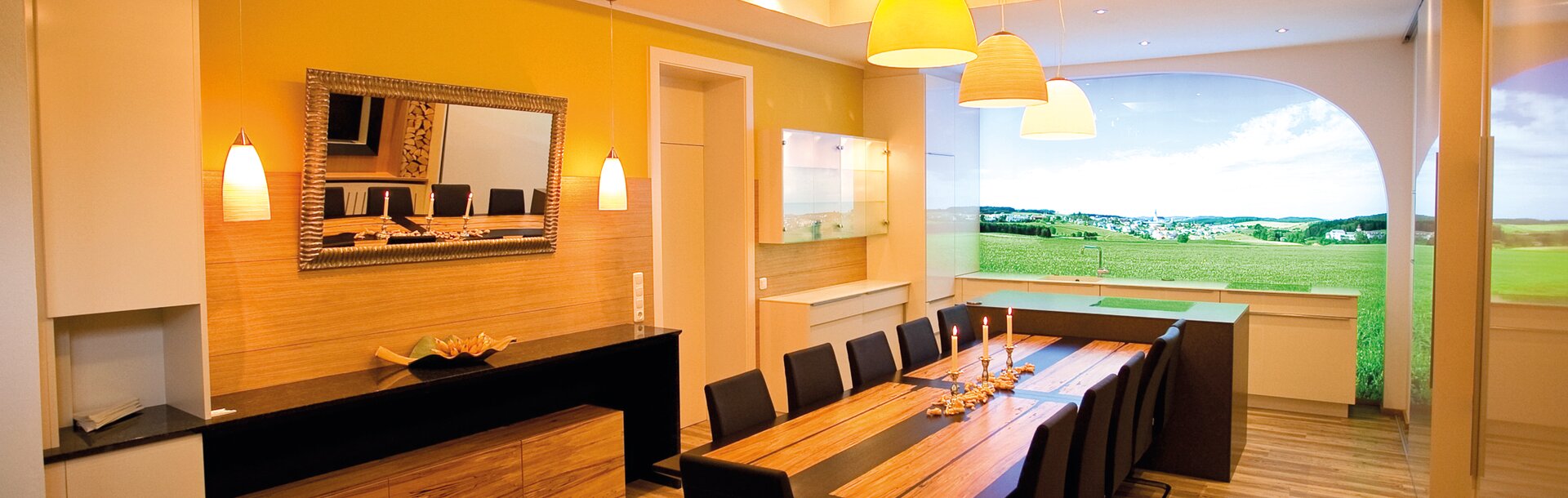 „Pomocí obří a zezadu podsvícené skleněné stěny se nám podařilo úplně změnit charakter místnosti“, říká Katzmaier. Prostor fascinuje překrásným panoramatem idylického Reichenthalu – skoro jako při pohledu z okna. Tým Katzmaierů chce v tomto prostoru zároveň předvést svým zákazníkům, co všechno je možné vyrobit z různých materiálů a za pomoci kreativních nápadů: „Velké čelní plochy jsme nalakovali krémovými odstíny ADLER Pigmopur a lesk jsme jim dodali pomocí laku ADLER Legnopur G90. Na to přišla ještě jedna vrstva laku ADLER PUR-Antiscratch HQ pro zvýšení celkové odolnosti a odolnosti proti poškrábání“, popisuje stolařka, která před deseti lety převzala podnik po svých rodičích. Nyní se ona a celý její tým často potkávají u srdeční záležitosti celé místnosti: velkého variabilního stolu, který zaujme kombinací čokoládového buku a kouřového dubu. „Jednotlivé díly jsme sklížili zcela novým způsobem, abychom se nemuseli vzdát překrásného efektu přírodních dýhovaných okrajů“, líčí Katzmaier. Tato svěží a smělá kombinace na jedné straně hladké a na straně druhé nápadné dřeviny byla použita i u ostatního nábytku - a také byla přelakována pomocí laku ADLER Legnopur G90.
