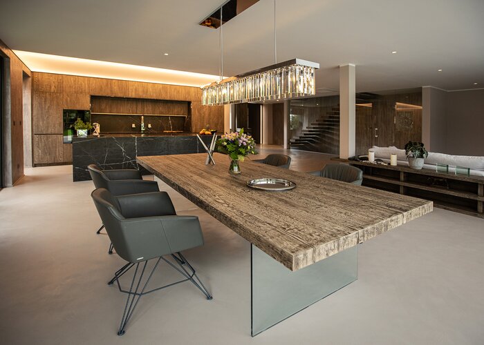 Tuto speciální povrchovou úpravu vytvořenou na míru najdete na kuchyňské lince, jídelním a konferenčním stole, v zádveří i koupelně, schodech nebo třeba na dveřích a okolním obložení. Tento společný prvek – starý dub s patinou – dokonale ladí s tlumeným šedobéžovým nátěrem stěn, propojuje celý interiér a dodává mu dojem klidné elegance. Vila tak ani přes některé studeně působící moderní materiály – jako je chromový povrch lustru nad jídelním stolem, hladká betonová podlaha, ocelové podnože židlí nebo kuchyňský ostrůvek s povrchem vyvedeným v černém mramoru – vůbec nevyvolává pocit odtažitosti a neosobnosti, ale naopak působí velice příjemně. V bytě dcery byla na nábytku a dveřích použita dubová dýha mořená na světlý odstín mořidlem Arova Spritzbeize Weiss a dokončena transparentním dvousložkovým PUR lakem na nábytek Ratiopur G10/Legnopur G10. Ten dodal požadovanou trvanlivost a odolnost a zároveň nechal vyniknout bíle mořenému dubu. Interiér s čistými liniemi nábytku tak působí svěže a vzdušně – přesně tak, jak si to mladá dáma přála. Jak je vidět, spolupráce odborníků, kteří do své práce dávají srdce, přináší vskutku výjimečné výsledky. A použití produktů ve vysoké kvalitě a se špičkovou výdrží je pomyslnou korunou celého projektu.