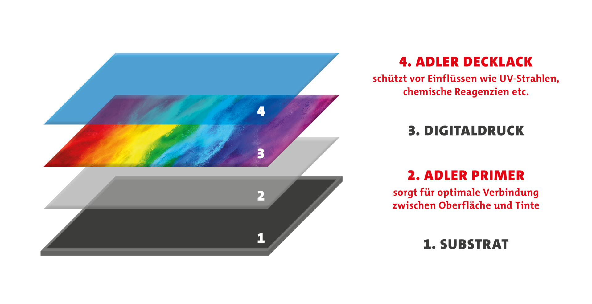 Povrchy upravené digitálním tiskem jsou vystaveny extrémním podmínkám. ADLER nabízí vodou ředitelný systém povrchové úpravy, který zajistí extrémní odolnost a maximální ochranu proti žloutnutí. Chrání před mechanickými vlivy a UV zářením, zabraňuje žloutnutí a zajišťuje dlouhodobou barevnou stabilitu. Naše systémy povrchové úpravy pro digitální tisk spojují dlouhou životnost s udržitelností a environmentální odpovědností na té nejvyšší úrovni.