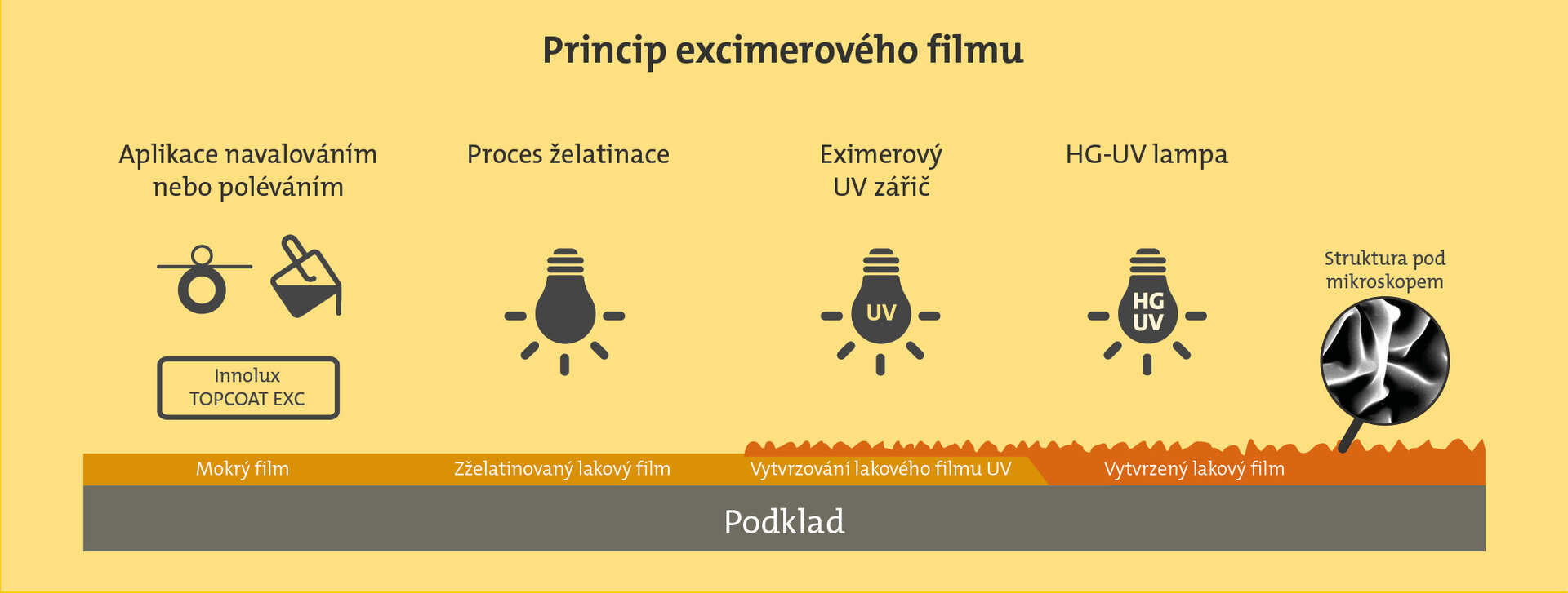 U této nové metody je kapalný UV vytvrzující excimerový lak "Innolux Topcoat EXC", který se nanáší navalováním, ozařuje krátkovlnným UV světlem (172 nm) bez přítomnosti kyslíku. To vede k povrchové polymeraci, která způsobí zmenšení objemu, což se zase projeví v povrchových záhybech různého stupně. Tato deformovaná "pokožka" vede k difúznímu odrazu světla, což vnímáme jako matný efekt. Úplné vytvrzení lakové vrstvy se bezprostředně potom zajistí ozářením pomocí UV sušičky.