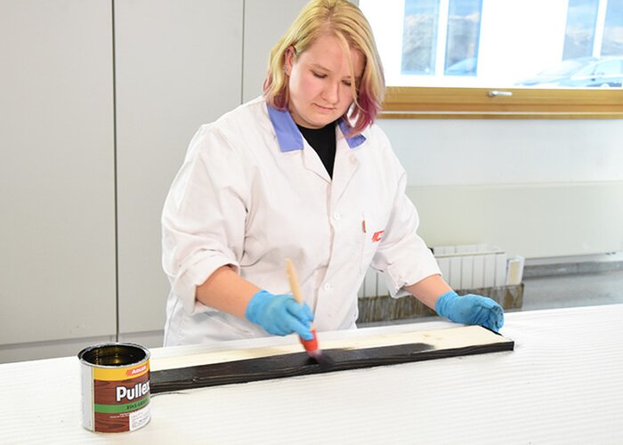 Mírně hnědo-žlutého efektu lze docílit, pokud dřevo natřete nejprve lazurou Pullex 3in1-Lasur v barevném odstínu RAL 9005 Tiefschwarz (temně černá) , a poté v odstínu Kiefer (borovice).